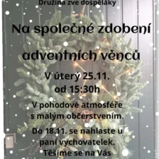Tentokrát se sejdeme v adventním čase a v příjemné atmosféře, při poslechu koled a vůně jehličí si vytvoříme adventní věnec. Připraveno bude malé pohoštění.