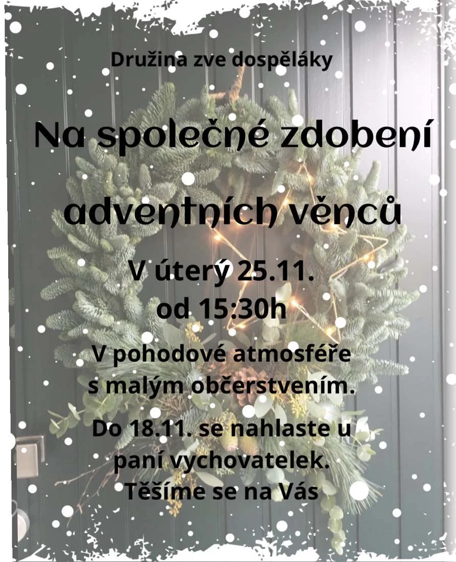 Děti přijdou s doprovodem. Přineste si s sebou polystyrenový věneček, zápichy na svíčky a svíčky.