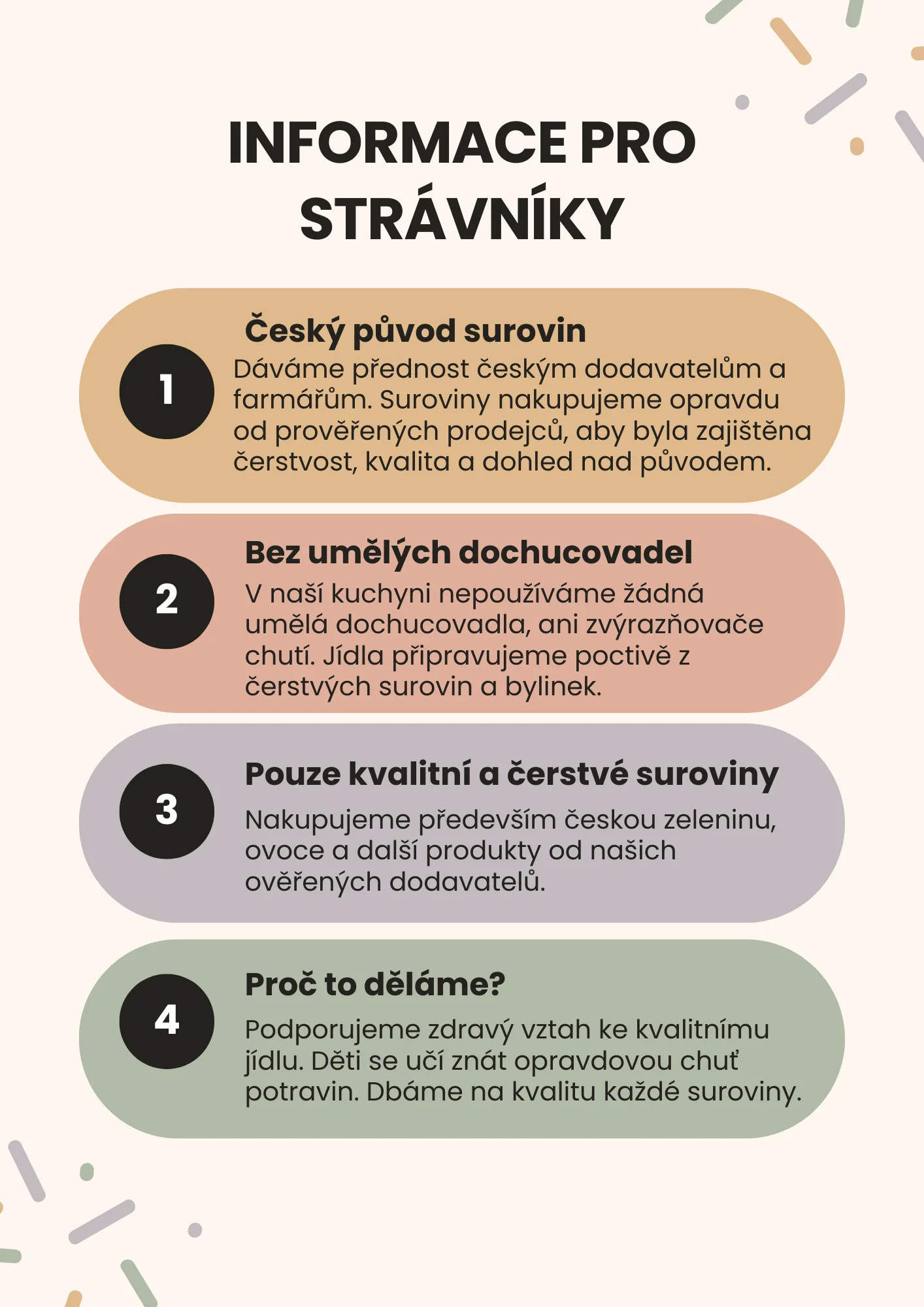 Poskytujeme strávníkům kvalitní a čerstvá jídla z poctivých surovin. Dbáme na český původ, nepoužíváme umělá dochucovadla a podporujeme zdravý vztah k jídlu.