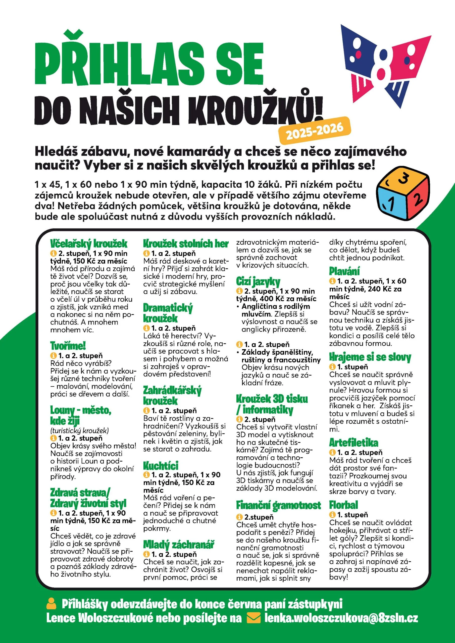 Podívejte se na nabídku všech kroužků a pokud Vás některý zaujme, vyplňte přihlášku a předejte příslušnému třídnímu učiteli nebo zašlete na lenka.woloszczukova@8zsln.cz. Časový rozvrh bude upřesněn v průběhu října.