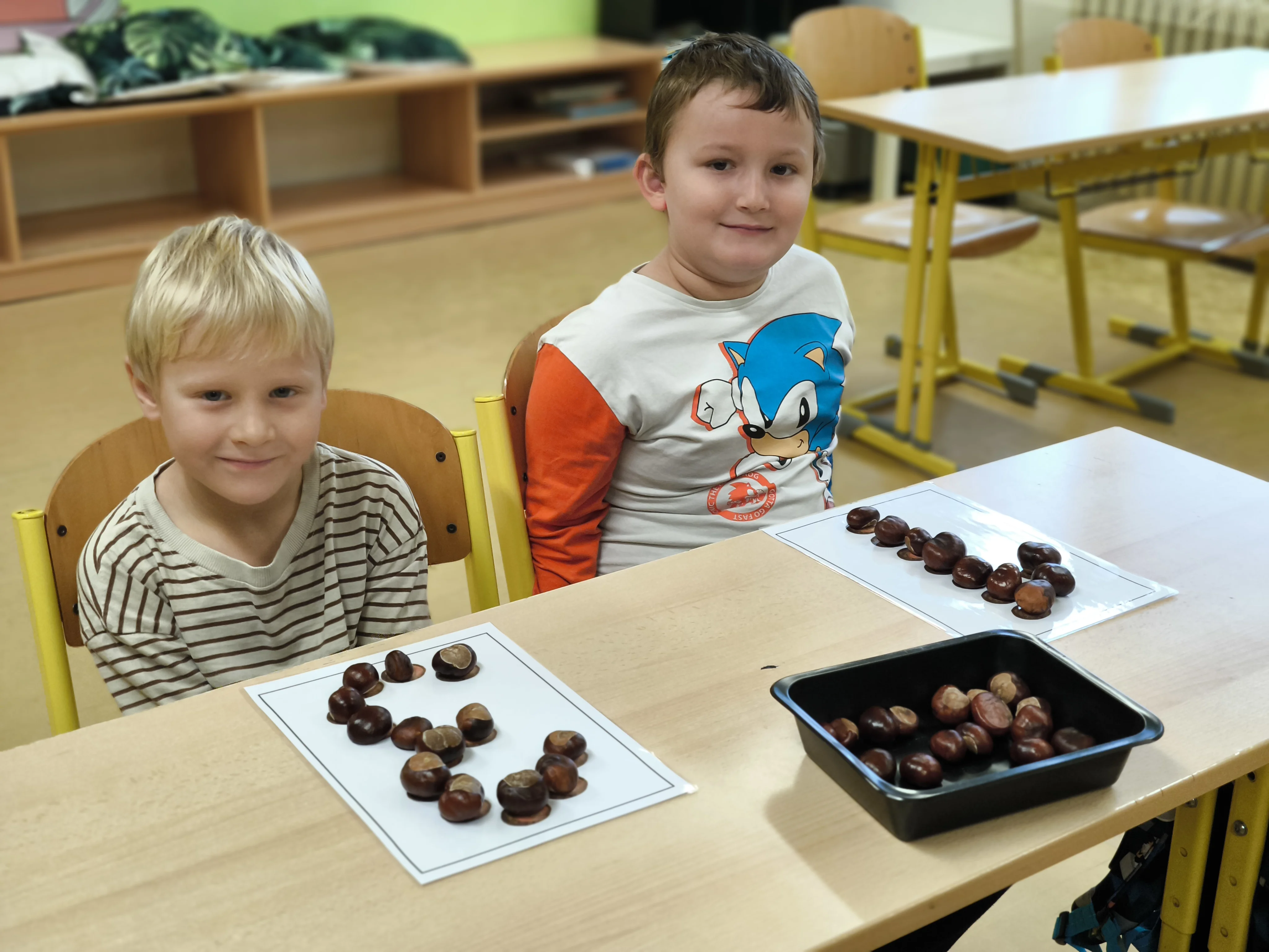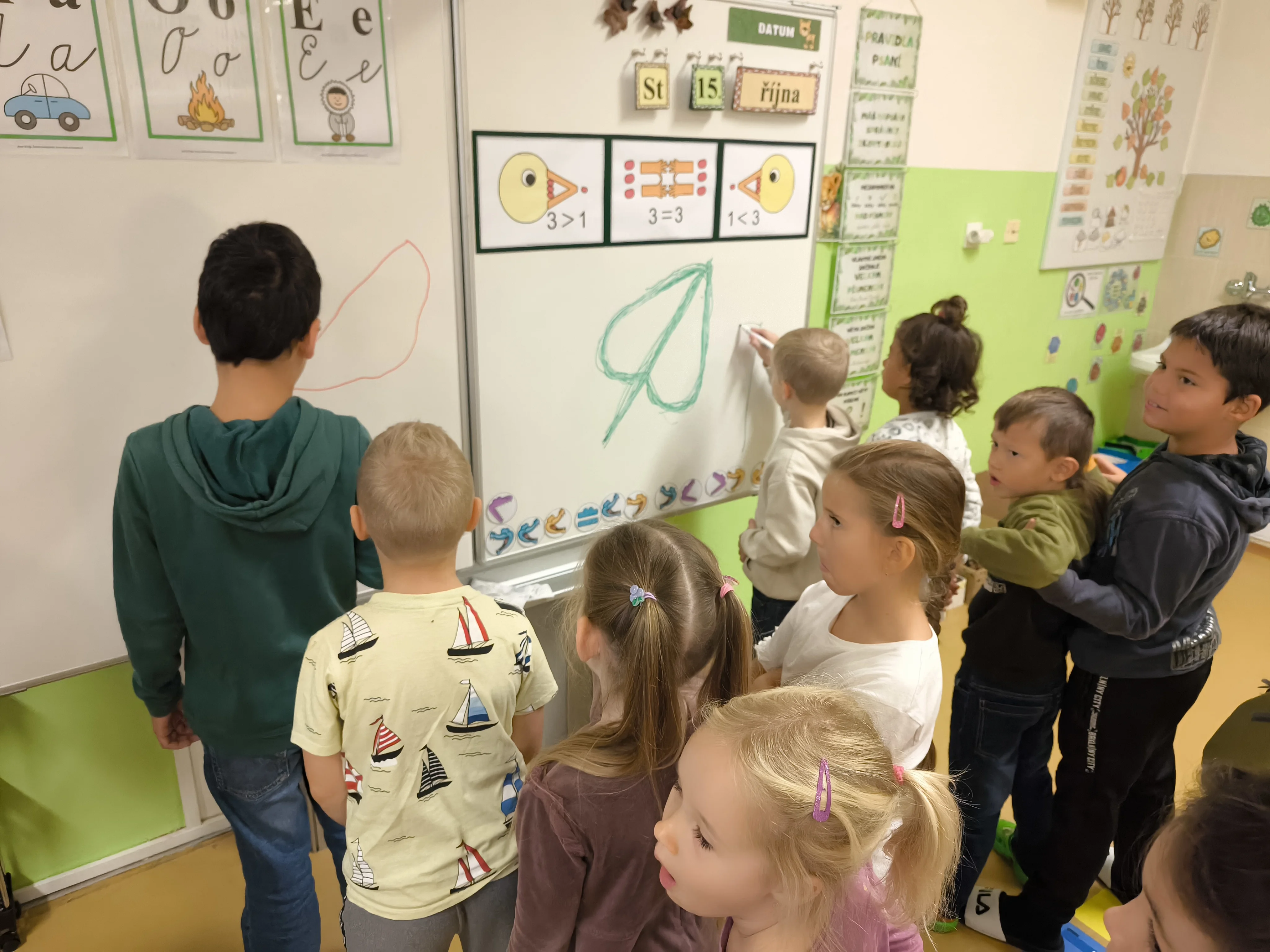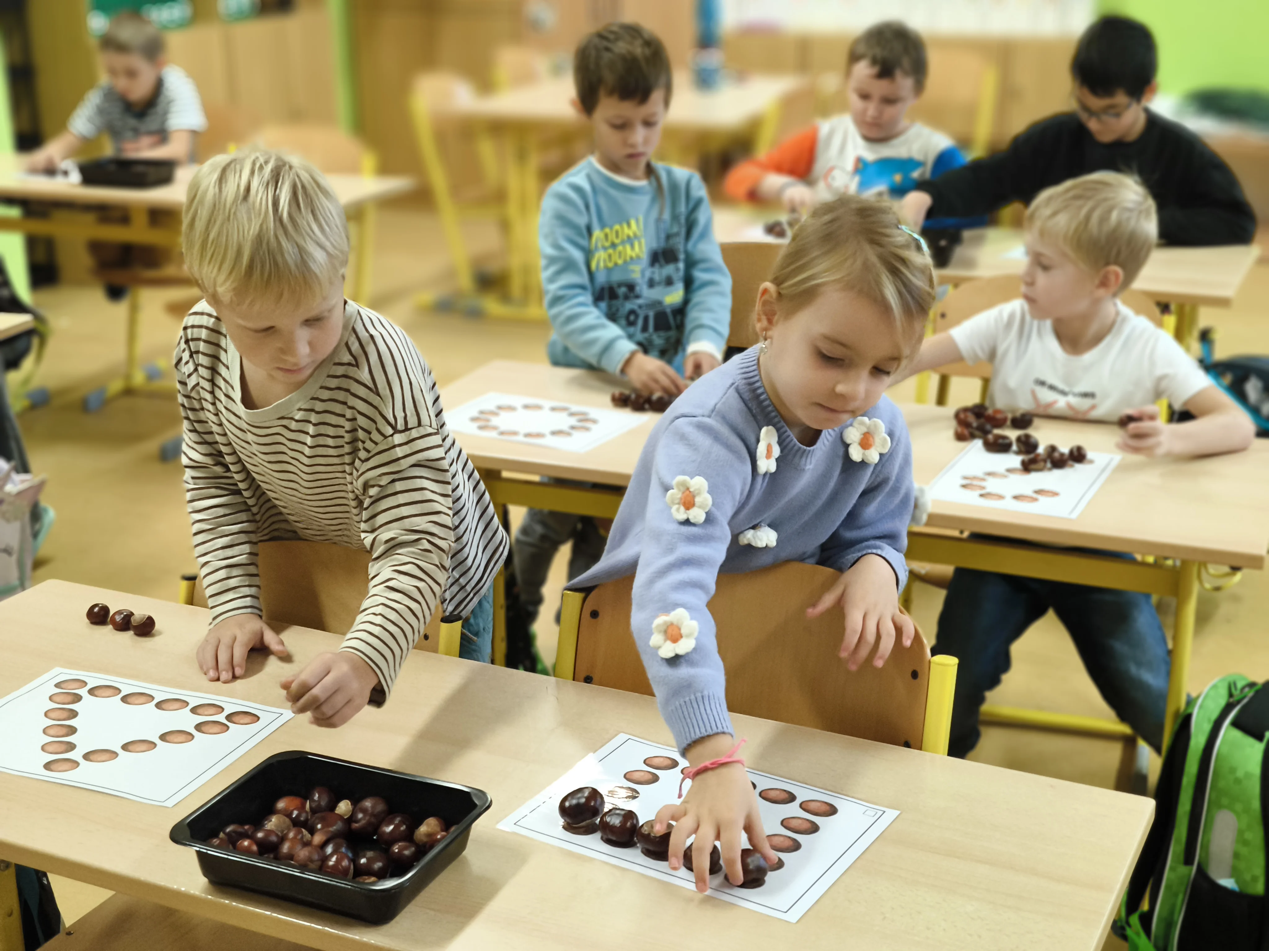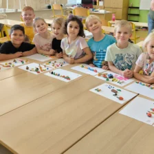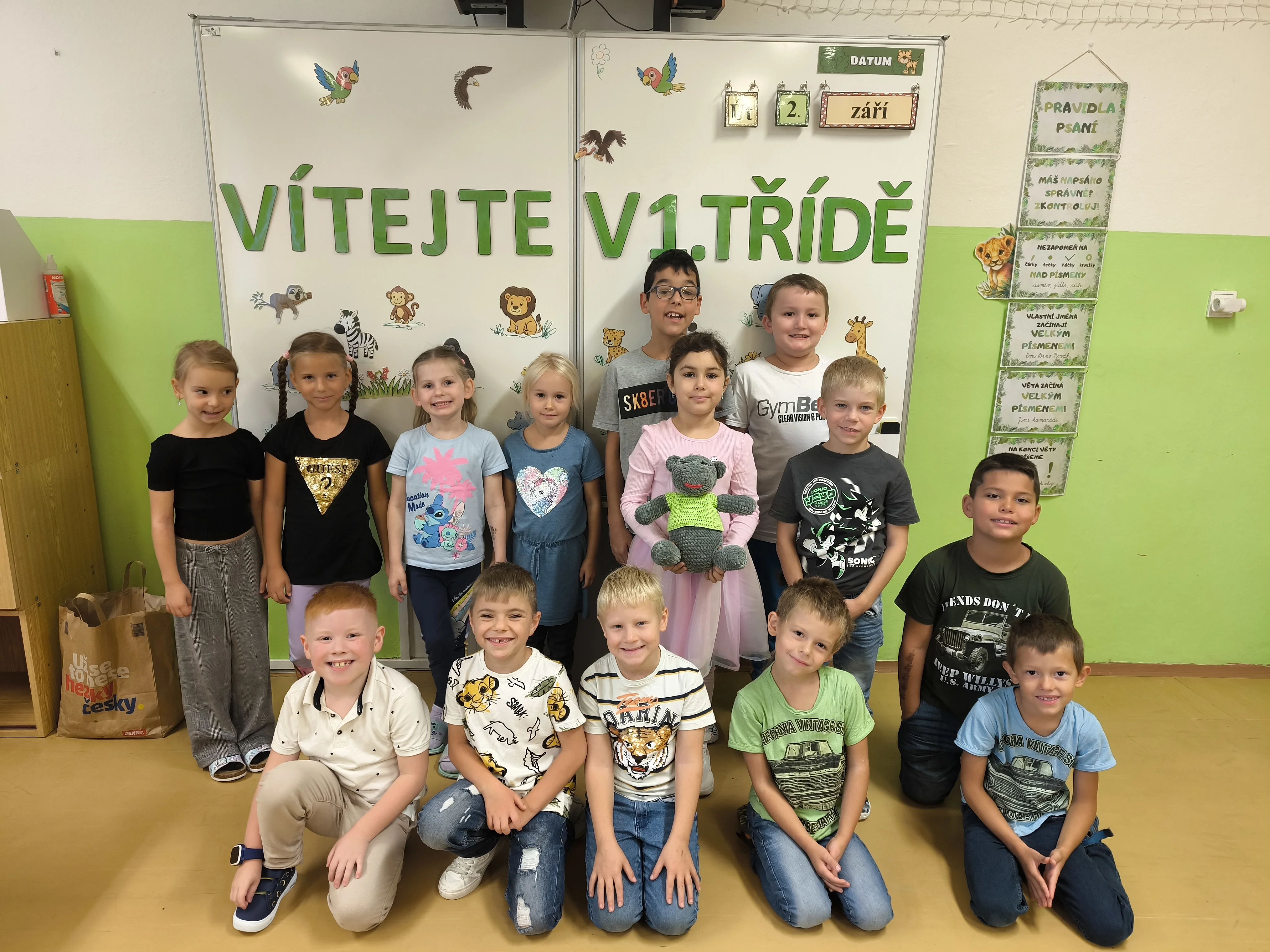 Naši prvňáčci prožili své první školní týdny plné nových zážitků, kamarádů a objevování. V září jsme se seznámili se školou i třídou, učili jsme se pravidlům, spolupráci a společně s maskotem Hrošíkem Hugem objevovali, jak to ve škole chodí. V matematice trénujeme počítání do pěti, porovnávání a orientaci v prostoru. V českém jazyce rozvíjíme sluchové vnímání, poznáváme první písmena a číslice a učíme se správně psát. Říjen prožíváme v podzimní náladě a už se ve škole cítíme jako doma.