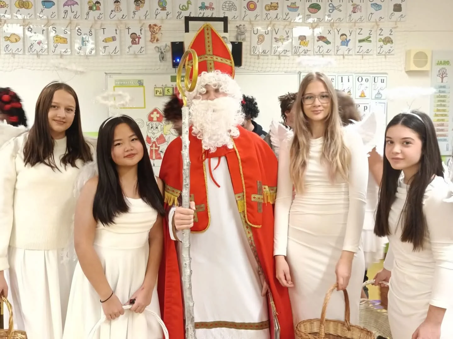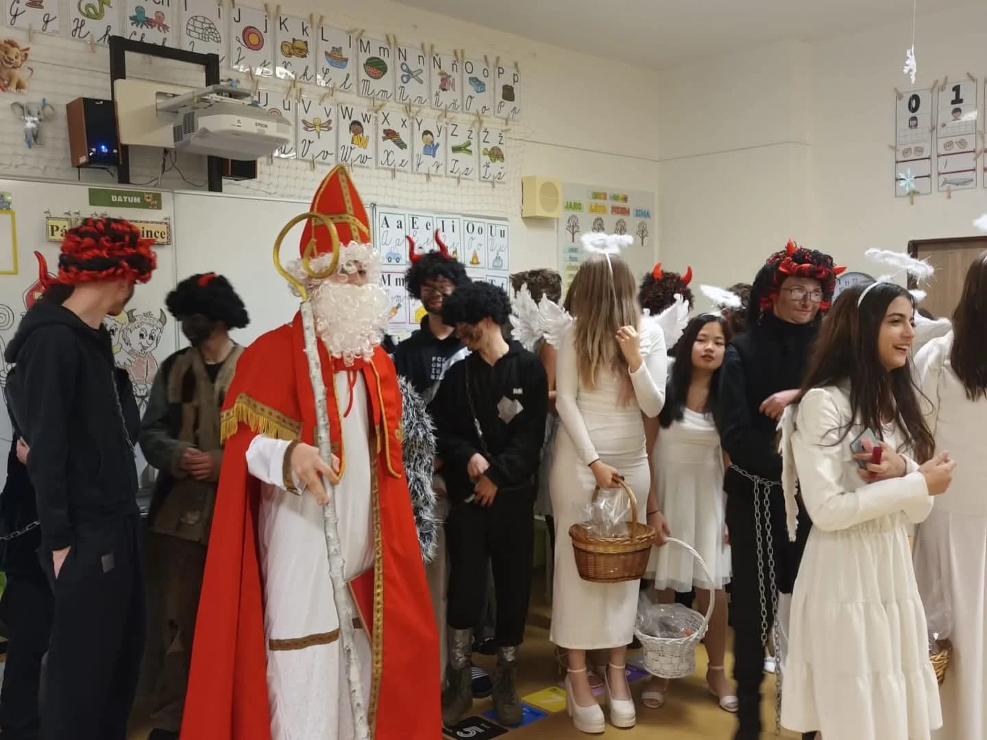 Mikuláš si s dětmi povídal o tom, jak se jim v první třídě daří, co se naučily a jak se jim daří dodržovat pravidla slušného chování. Andělé pochválili jejich snahu, kamarádské chování i to, jak se každý den zlepšují ve čtení a psaní. Čerti sice trochu zařinčeli řetězem, ale nakonec uznali, že máme šikovnou a celkem hodnou třídu.