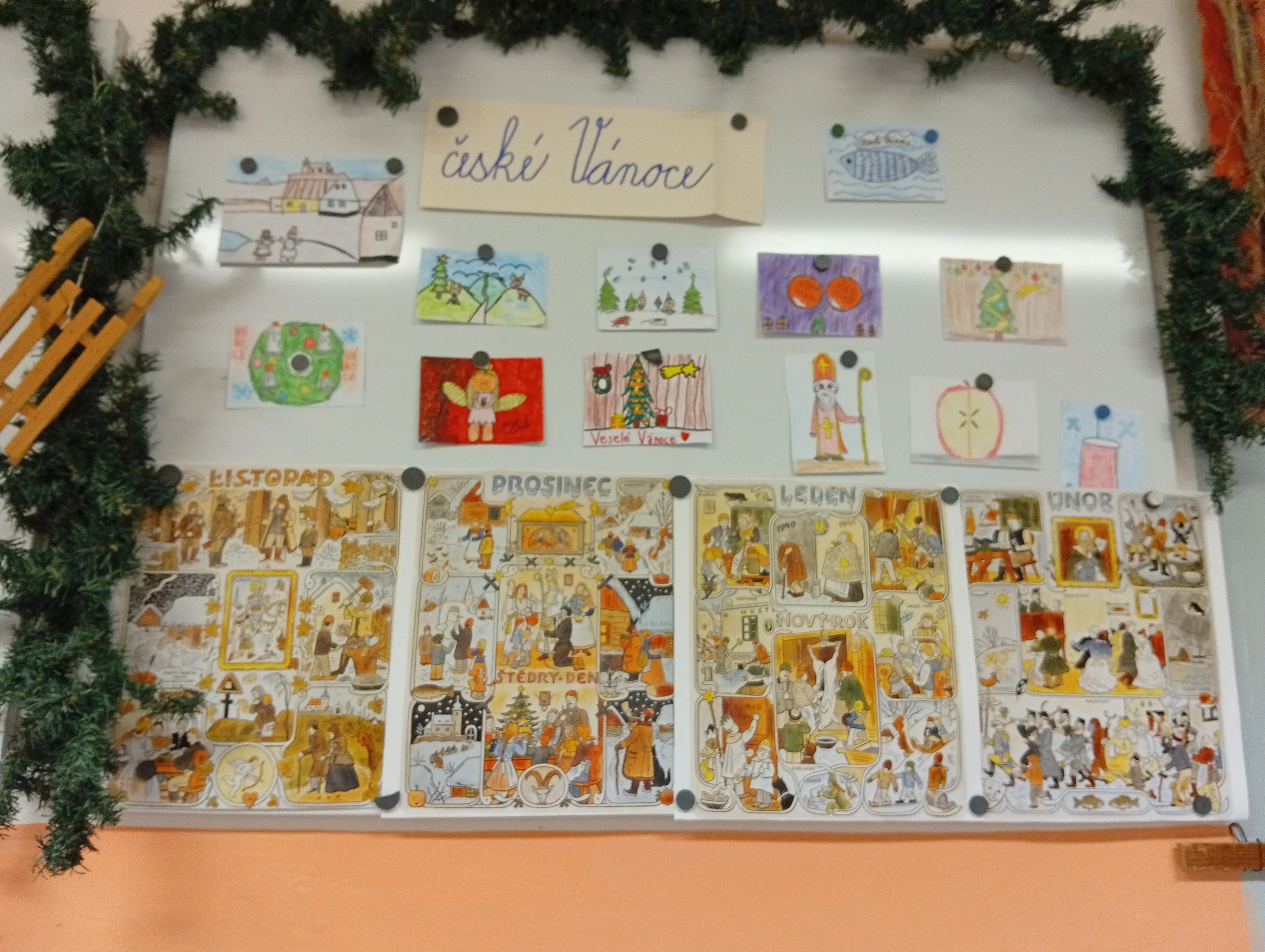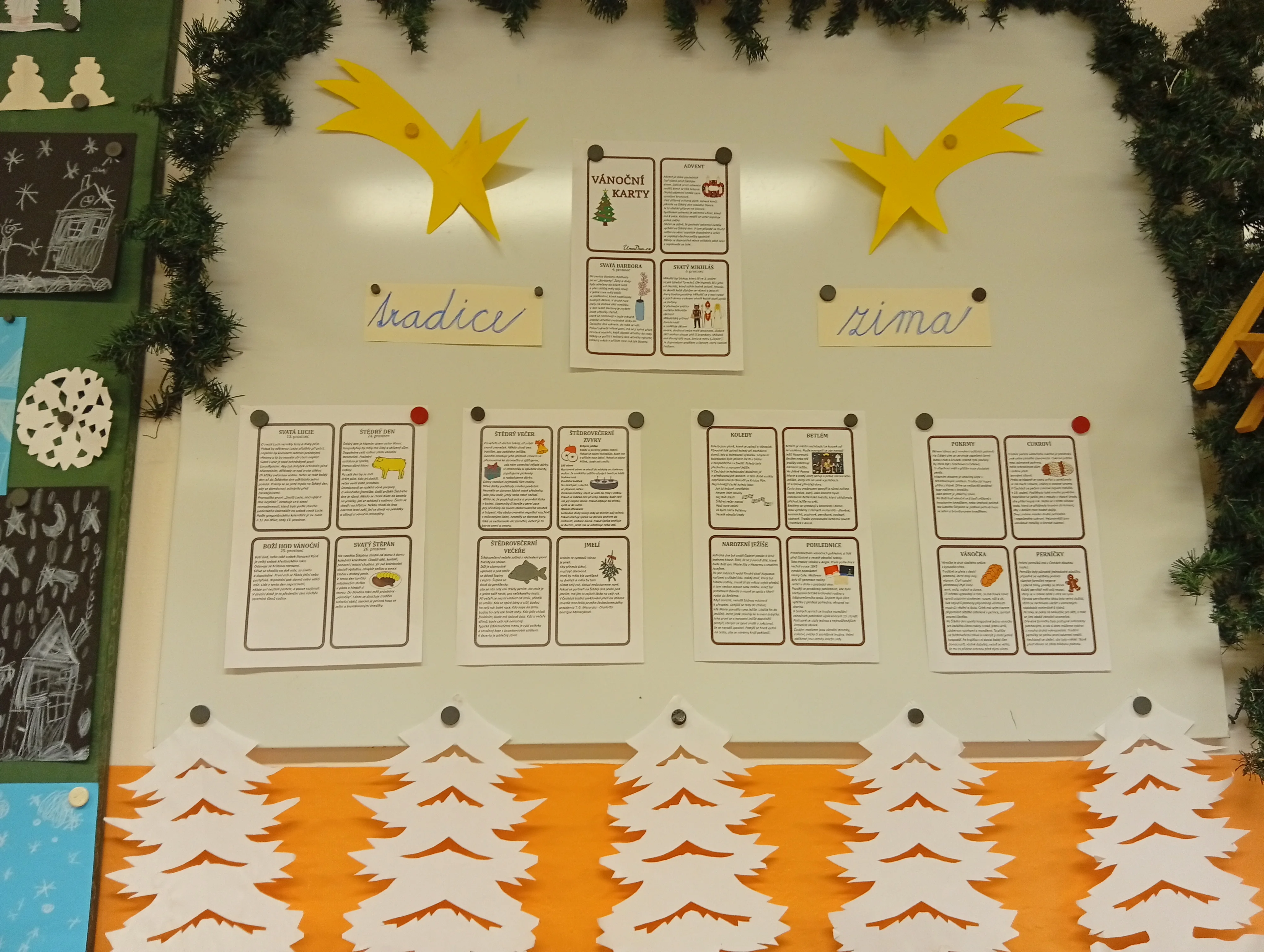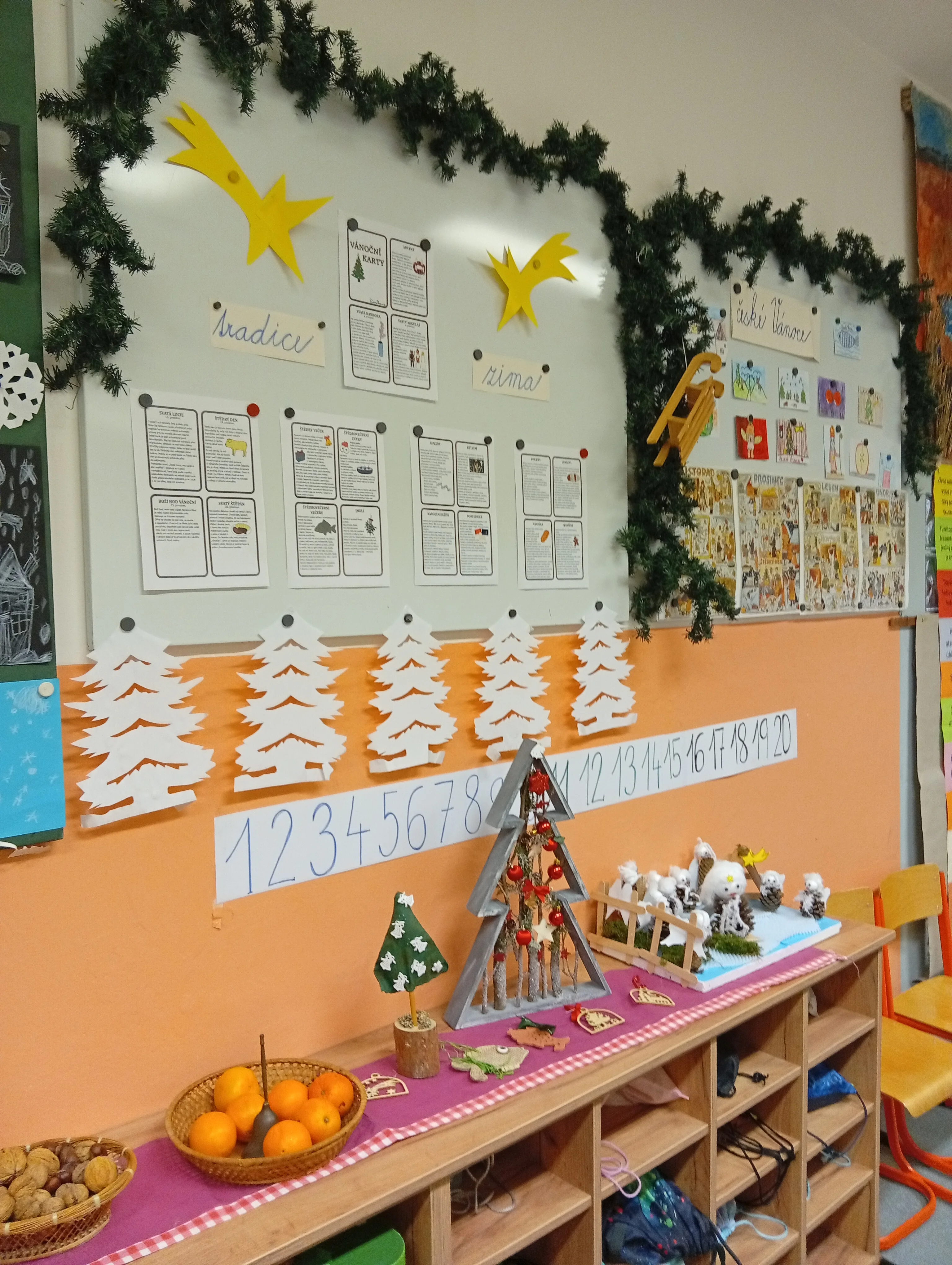 I toto bylo součástí výuky běžných předmětů, seznámit se s takovými tradicemi, které nesouvisí s dárky, ale naopak souvisí s pečením vánoček, perníků, cukroví, přípravou pokrmů, úklidem stavení, zdobením stromků a dalších. Veškeré poznatky jsme využili při výzdobě naší třídy. Nezapomněli jsme ani na malé ohlédnutí za velmi vydařenou vánoční akci před budovou školy.