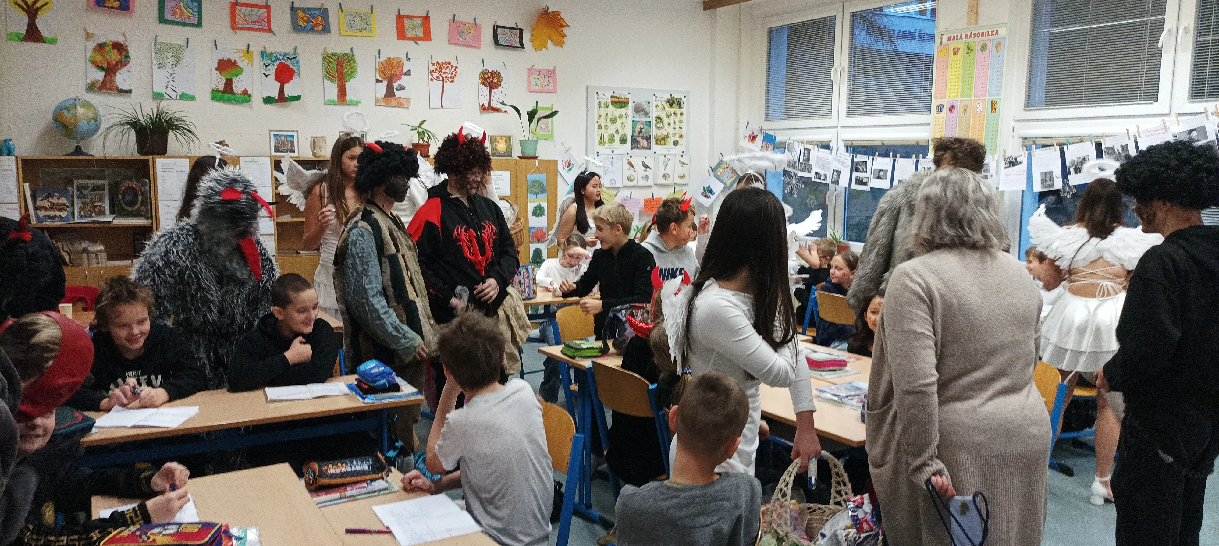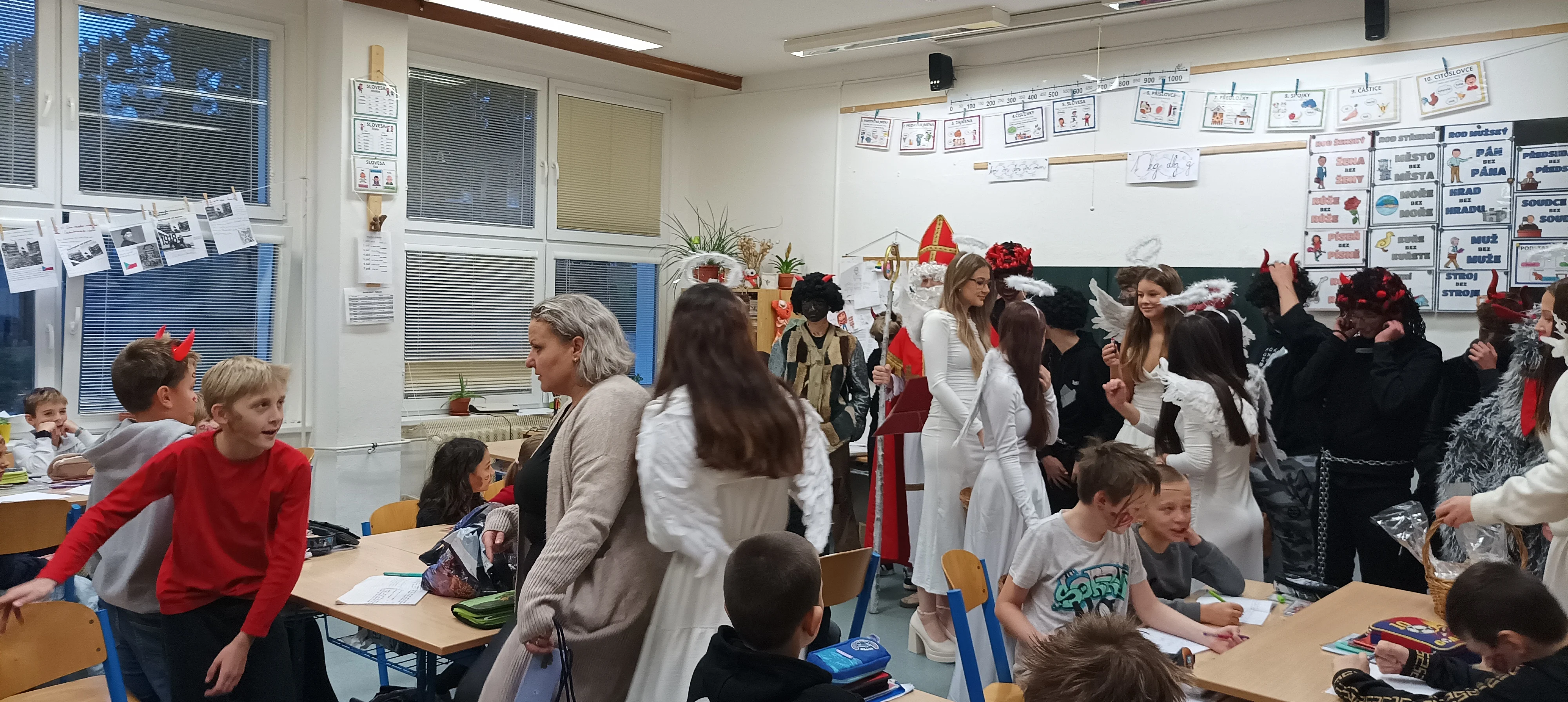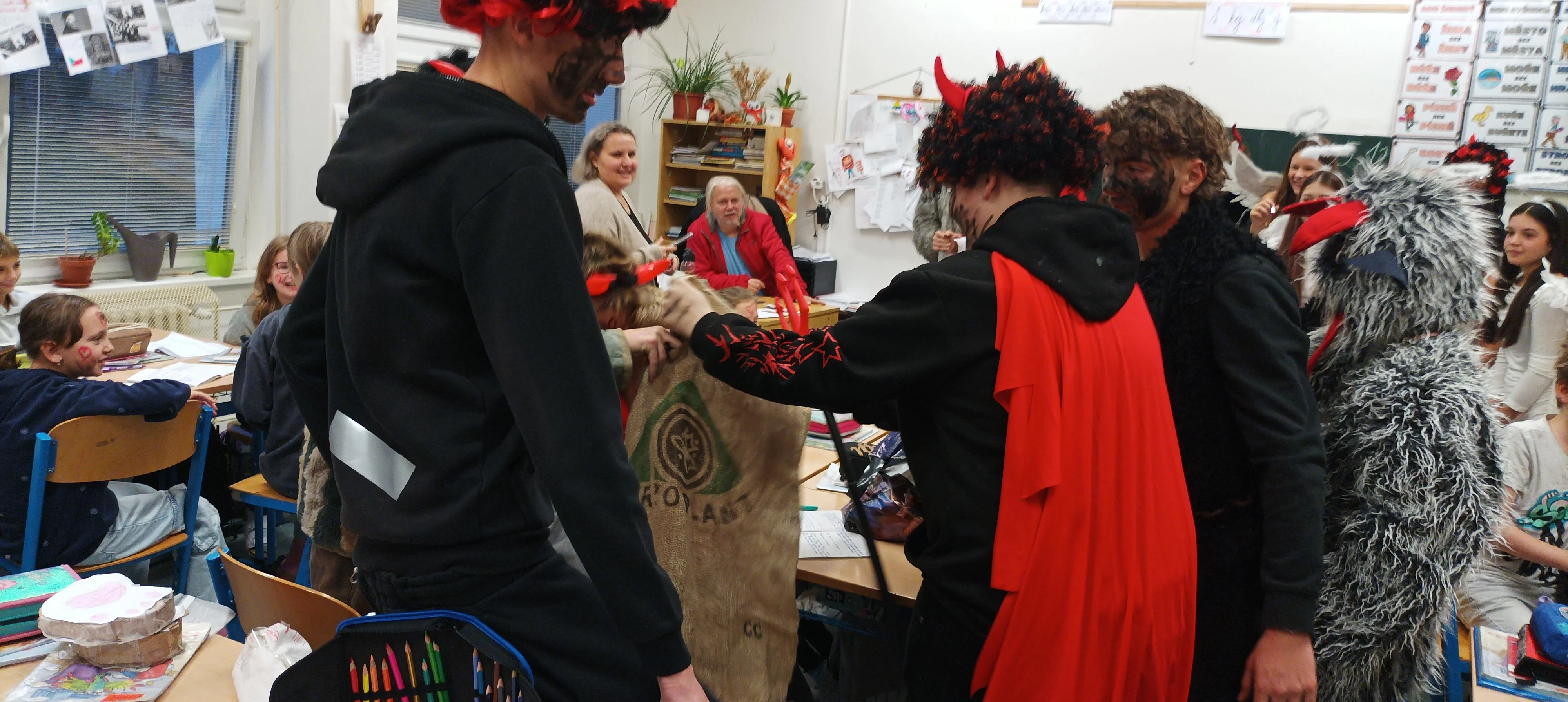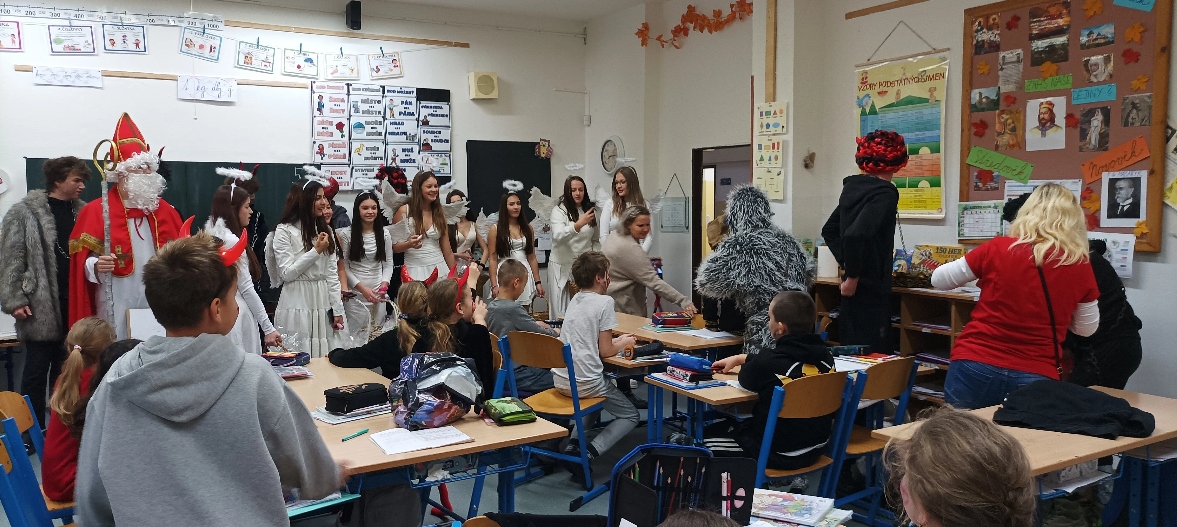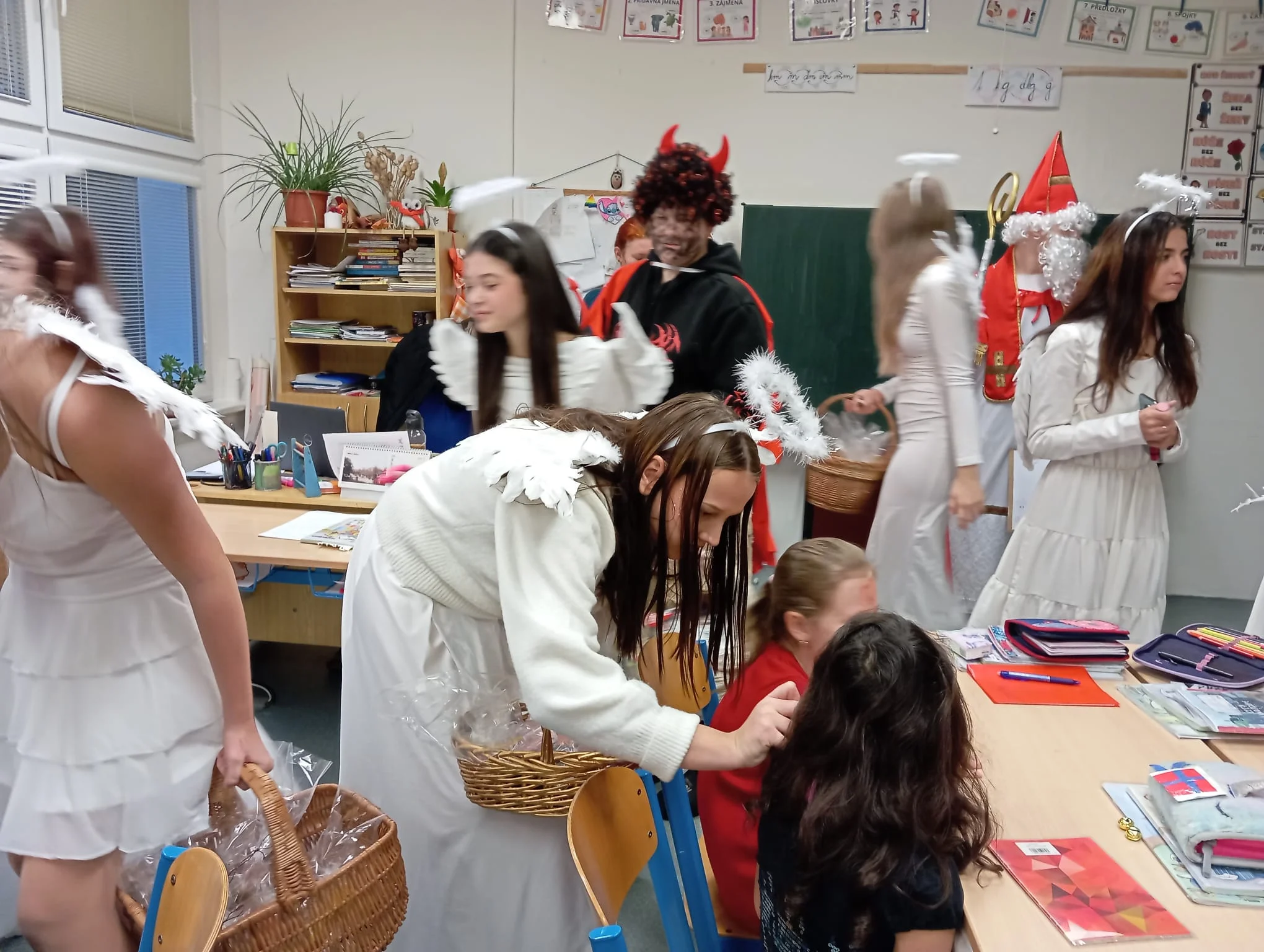 Mikulášskou nadílku pro nás připravili žáci devátých tříd, čertů bylo požehnaně, ale naštěstí i andělů se dostavilo dost:). Bohužel pár dětí skončilo v pytli, a tak doufejme, že se polepší a příští rok v pytli nikdo neskončí.