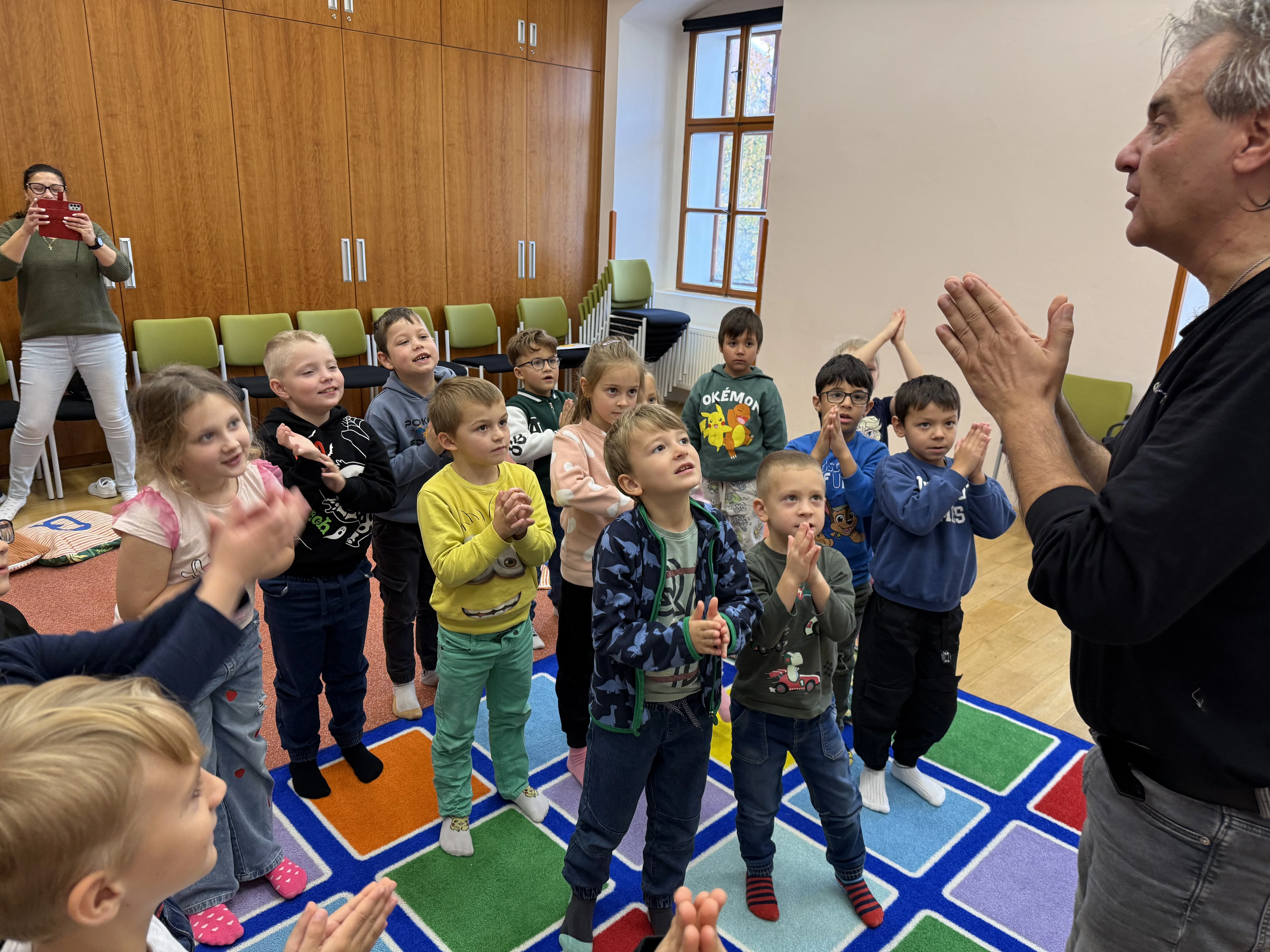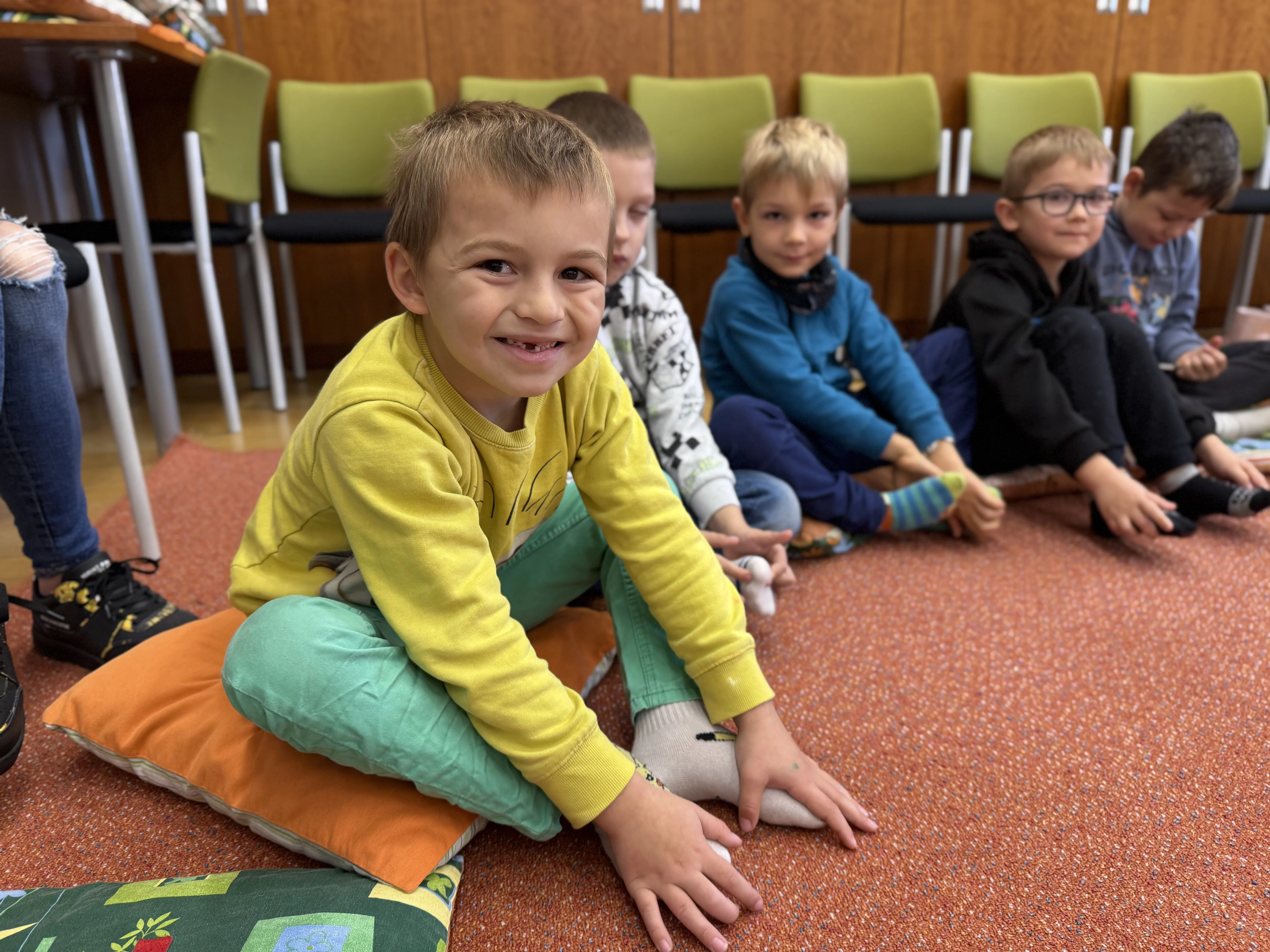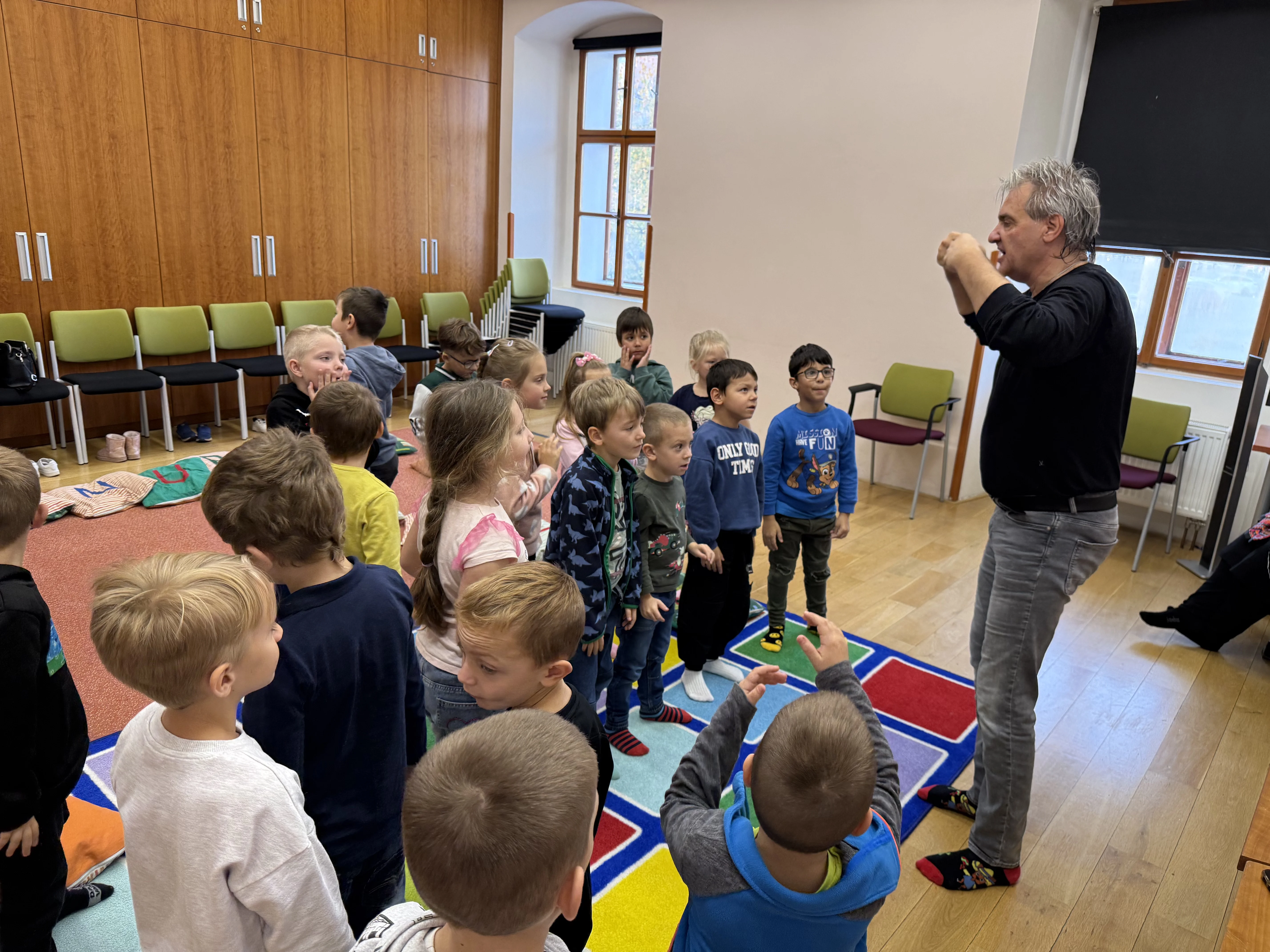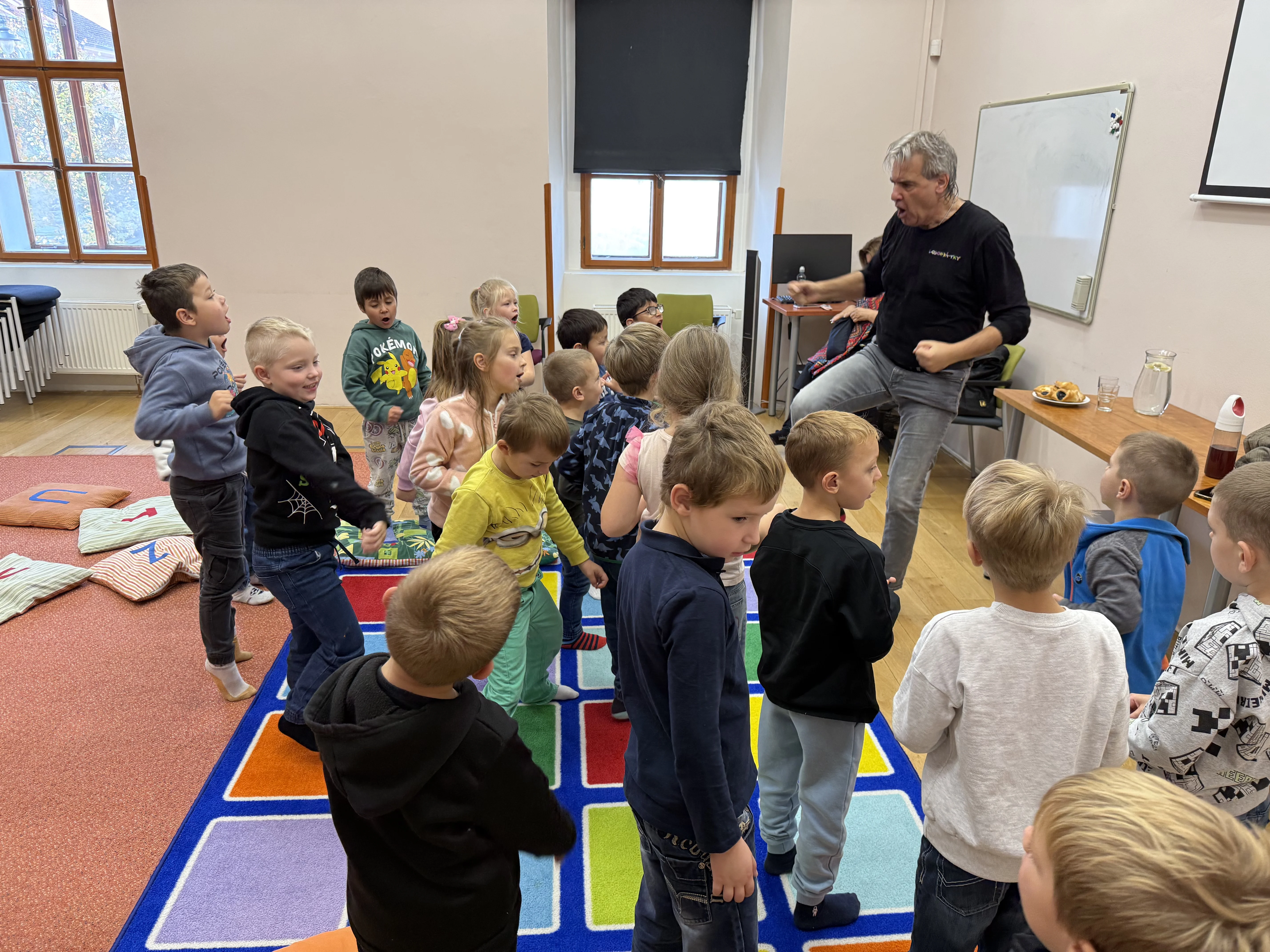 Dne 20.10.2025 jsme s dětmi navštívili městskou knihovnu v Lounech, kde proběhl zábavně-vzdělávací program „Pondělní parádičky“ se Slávkem Bourou.