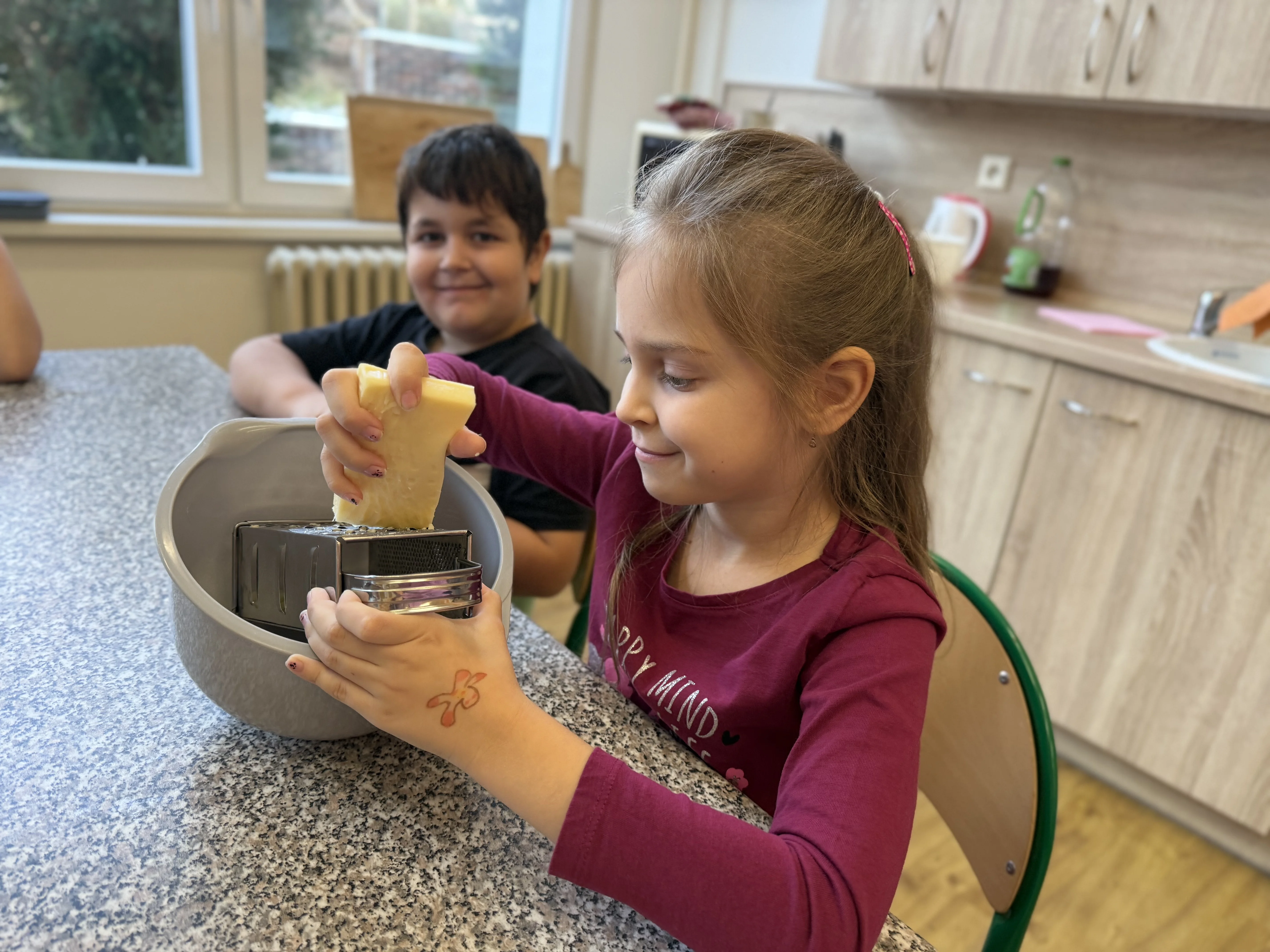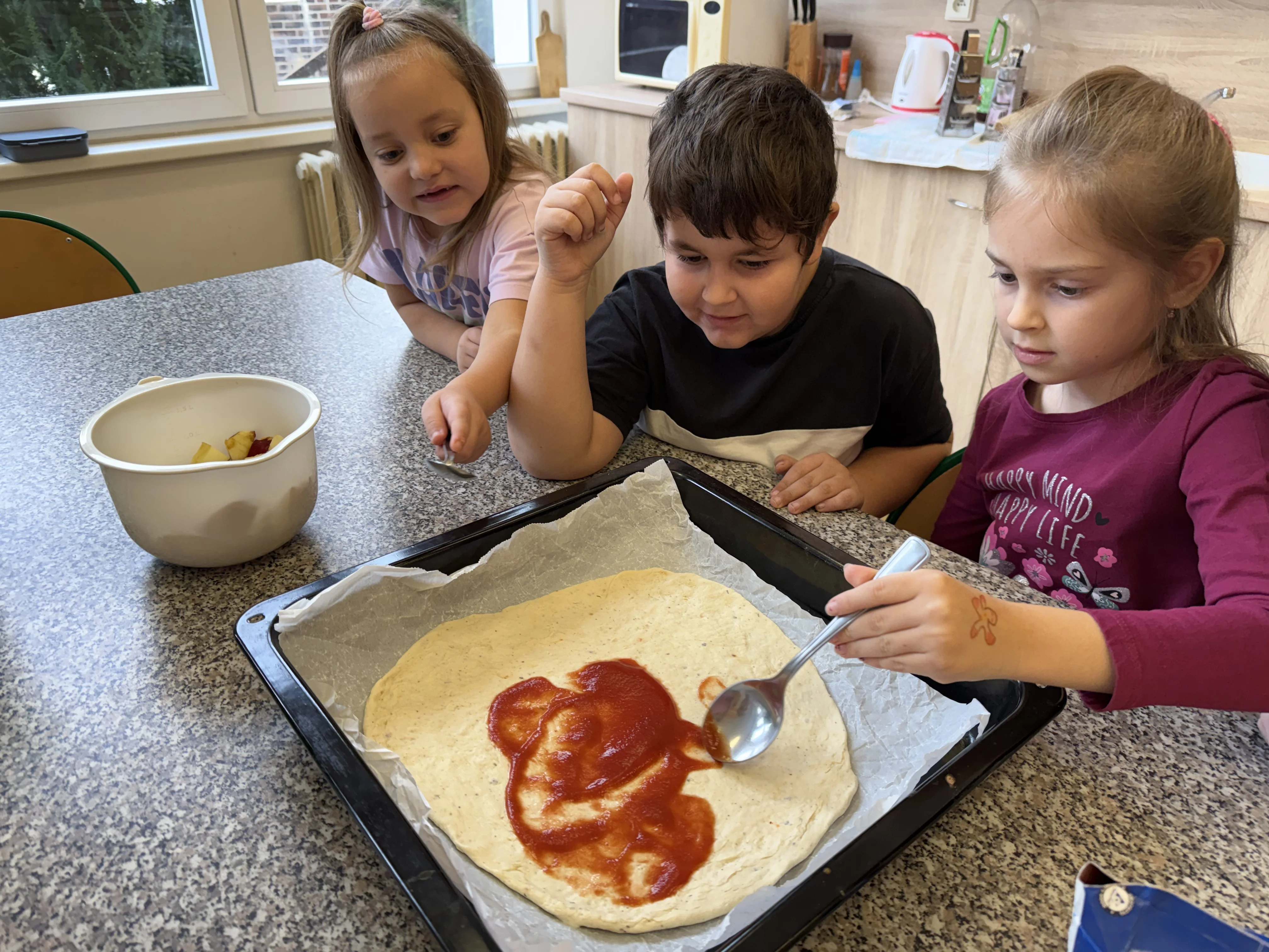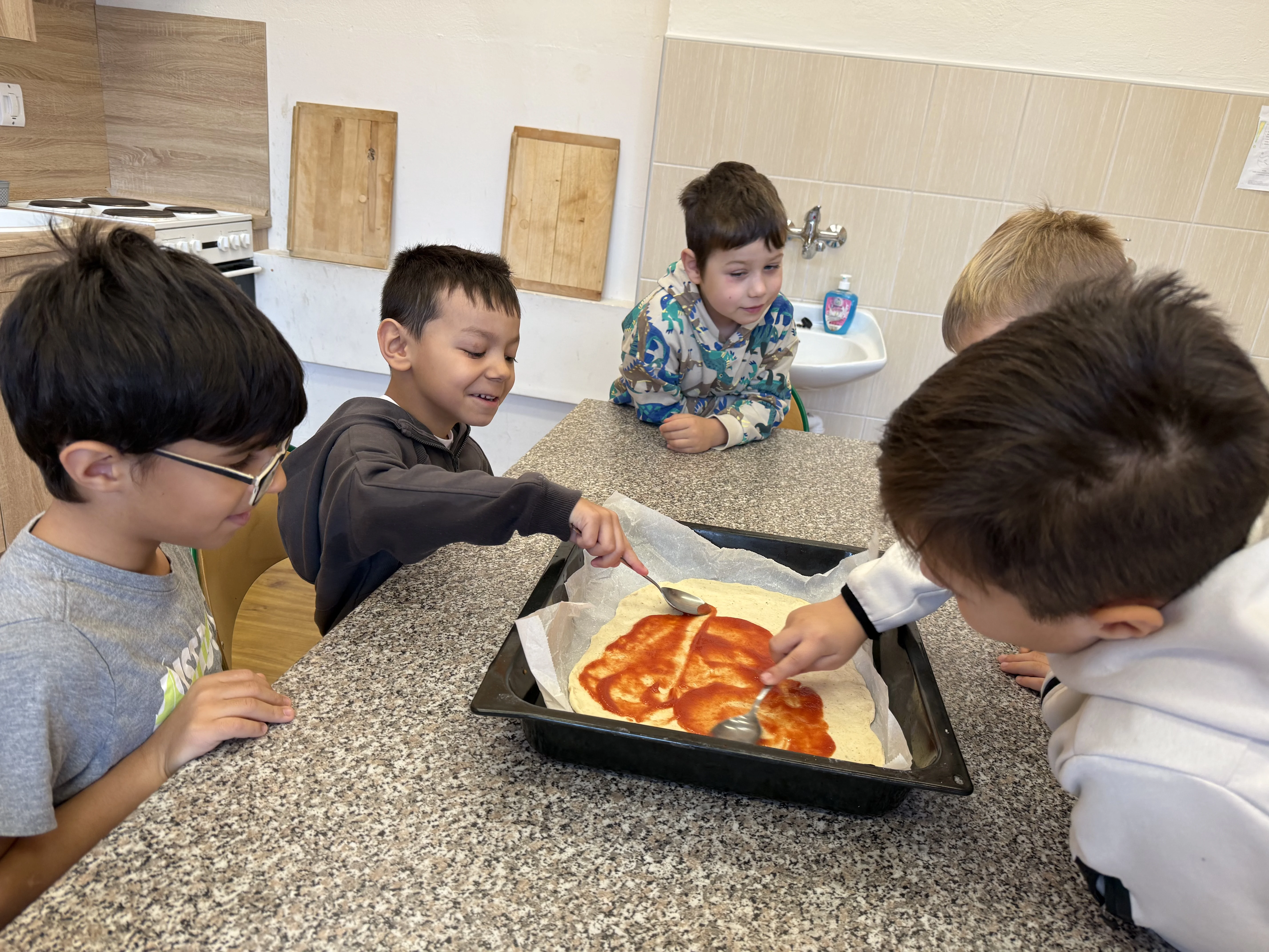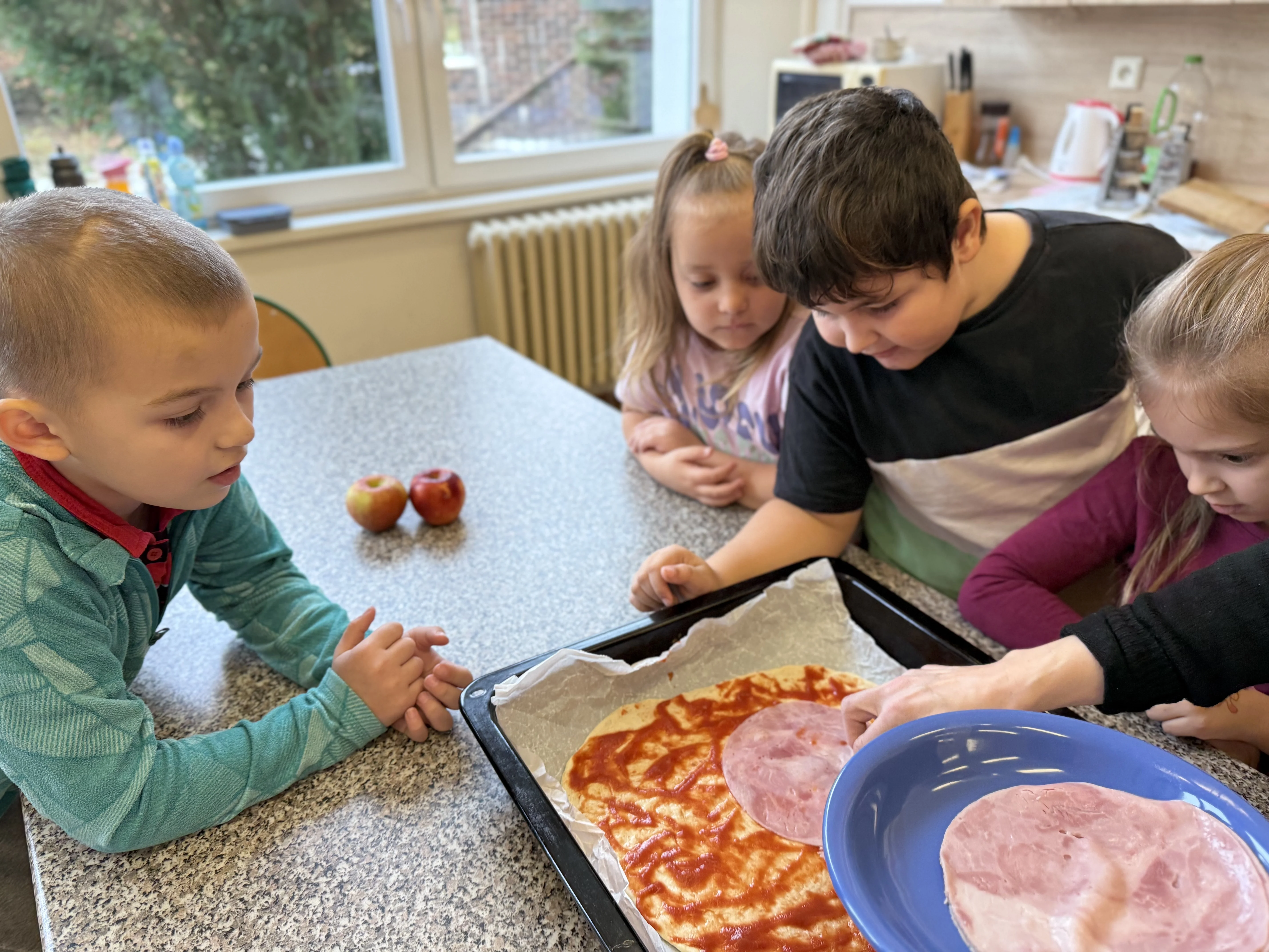 Dne 28.11.2025 si děti z přípravné třídy, v rámci programu Skutečně zdravá škola, připravily zdravou variantu mini pizzy. Podílely se na práci s těstem i na zdobení sýrem a kvalitní vysokoprocentní šunkou.